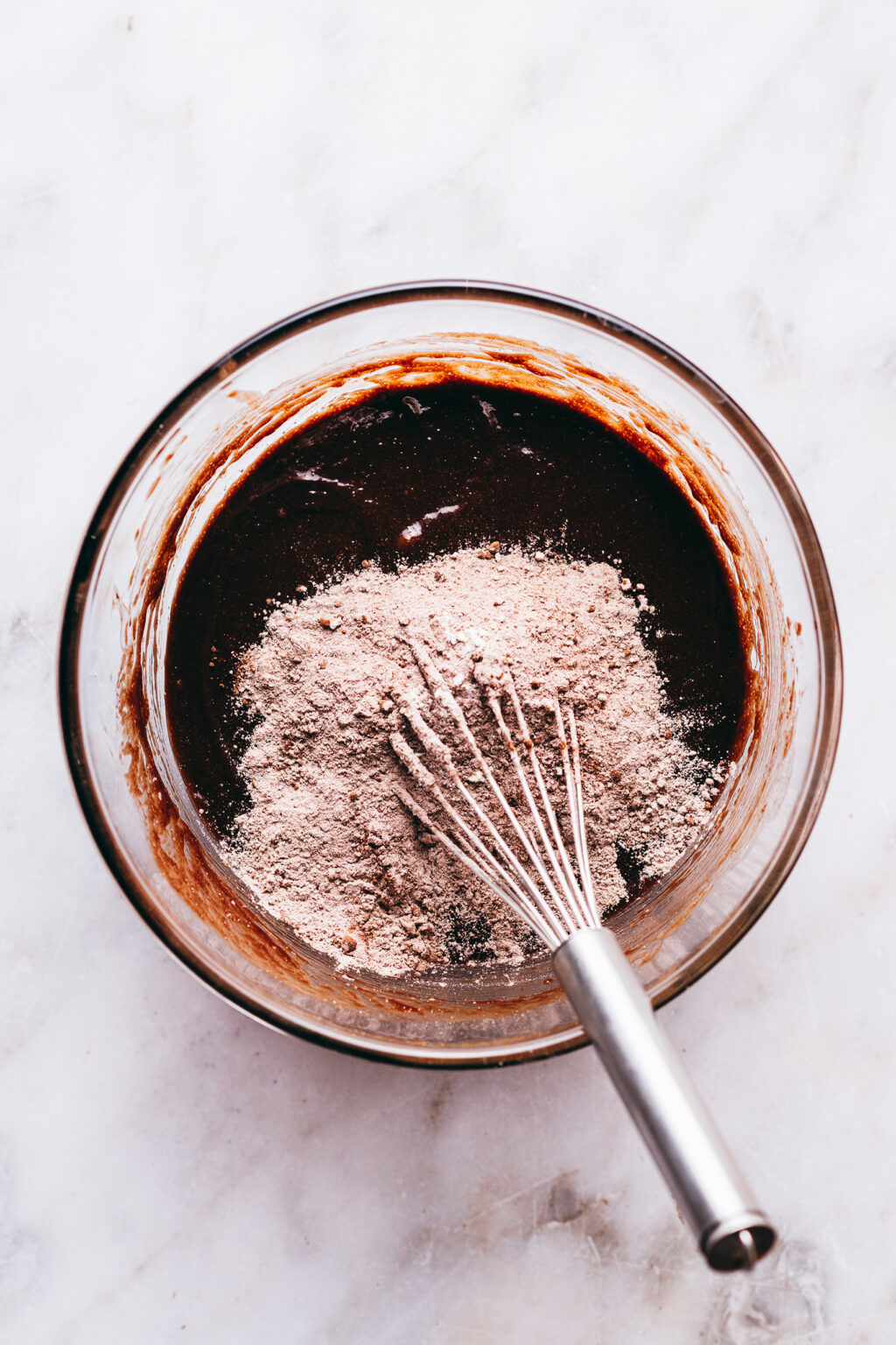 - A part, mélanger la farine, le cacao, le sel puis ajouter à la pâte. Battre juste ce qu'il faut pour ne plus voir de farine (sans trop insister).