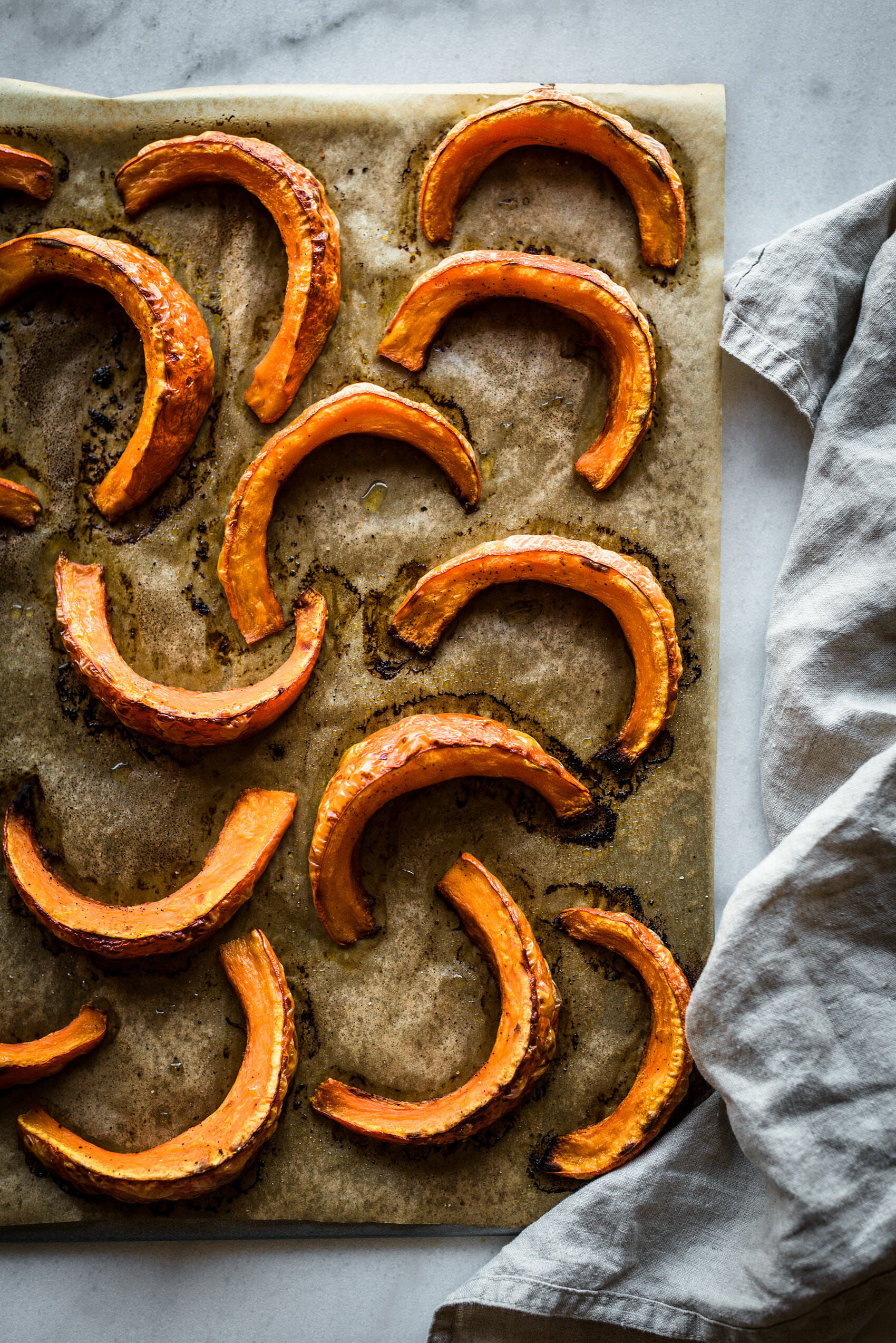 • Laver le potimarron et le couper en deux, puis faire des tranches. Les disposer sur une plaque surmontée de papier cuisson. Verser un filet d'huile d'olive, saler, poivrer puis enfourner environ 45 minutes (jusqu'à ce que le potimarron commence à dorer sur les bords).